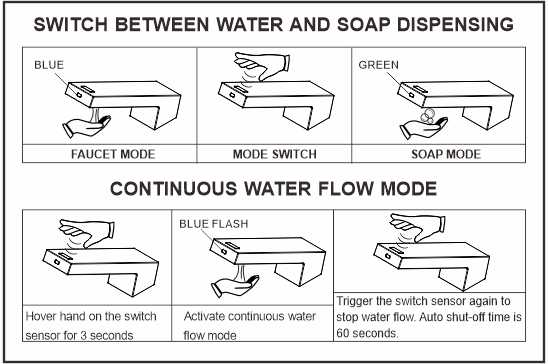 O funcție de flux continuu de apă încorporată poate fi activată prin menținerea unei mâini deasupra senzorului de comutare timp de 3 secunde, permițând apei să curgă constant fără a fi nevoie să se activeze senzorul repetat. Această caracteristică este deosebit de convenabilă pentru spălare sau curățare, făcând-o ideală pentru clădiri comerciale sau chiar pentru medii rezidențiale unde un flux de apă extins poate fi necesar ocazional. Pentru medii publice sau cu trafic intens, această funcție poate fi dezactivată prin setarea implicită pentru a asigura conservarea apei și a reduce utilizarea abuzivă.